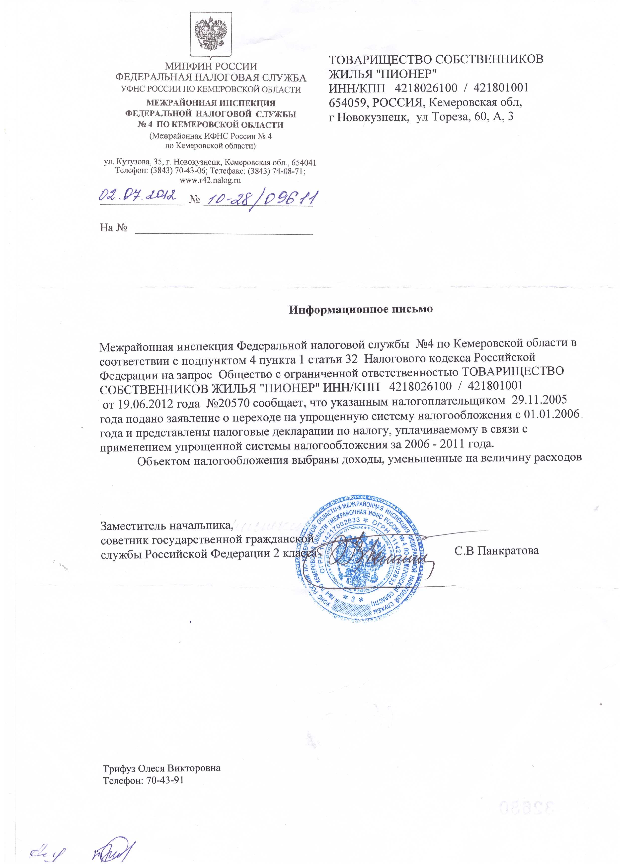 Информационное письмо о переходе на УСН_ТСЖ Пионер |