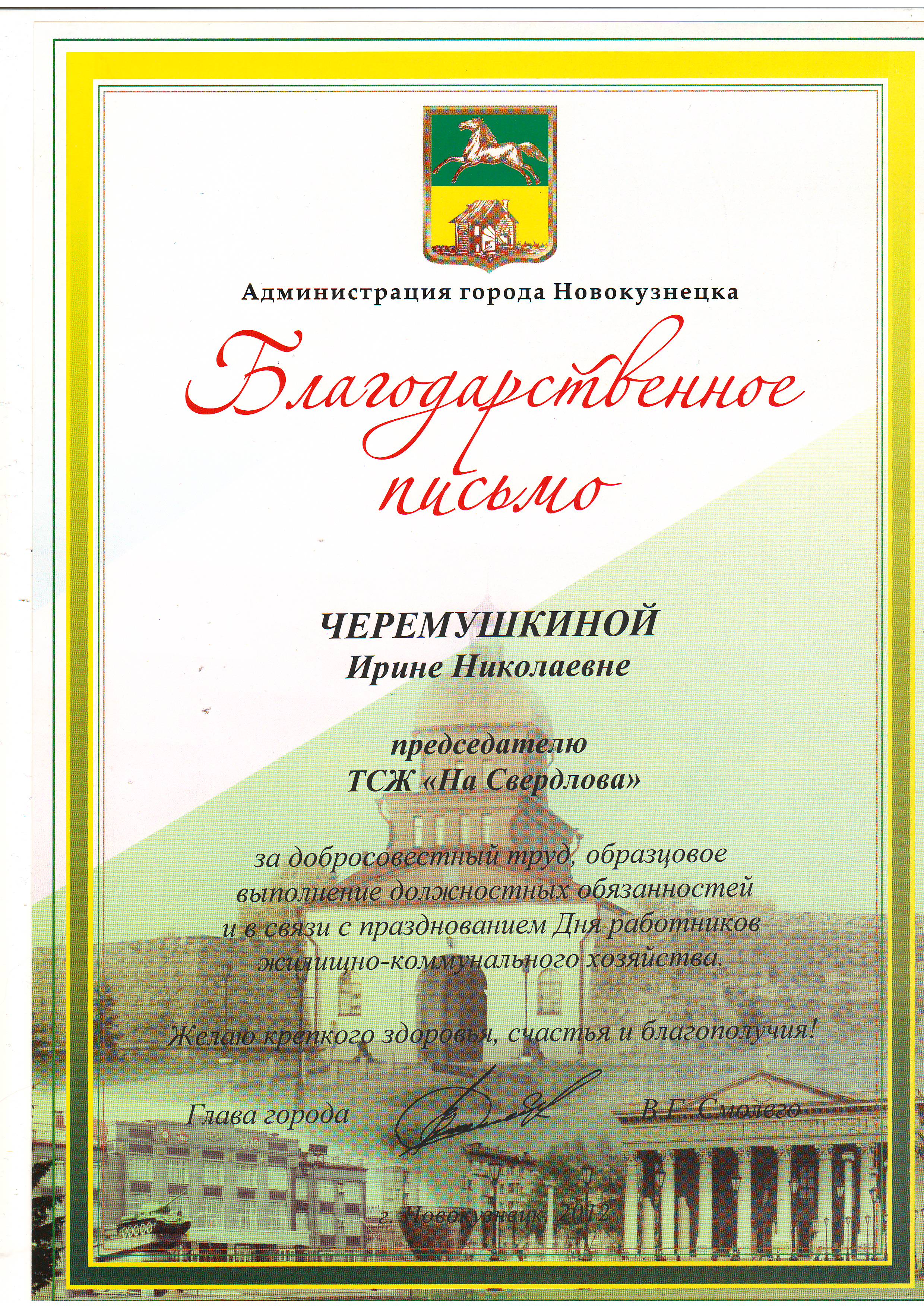 Благодарственное письмо от администрации Новокузнецка ТСЖ На Свердлова_2012 год |