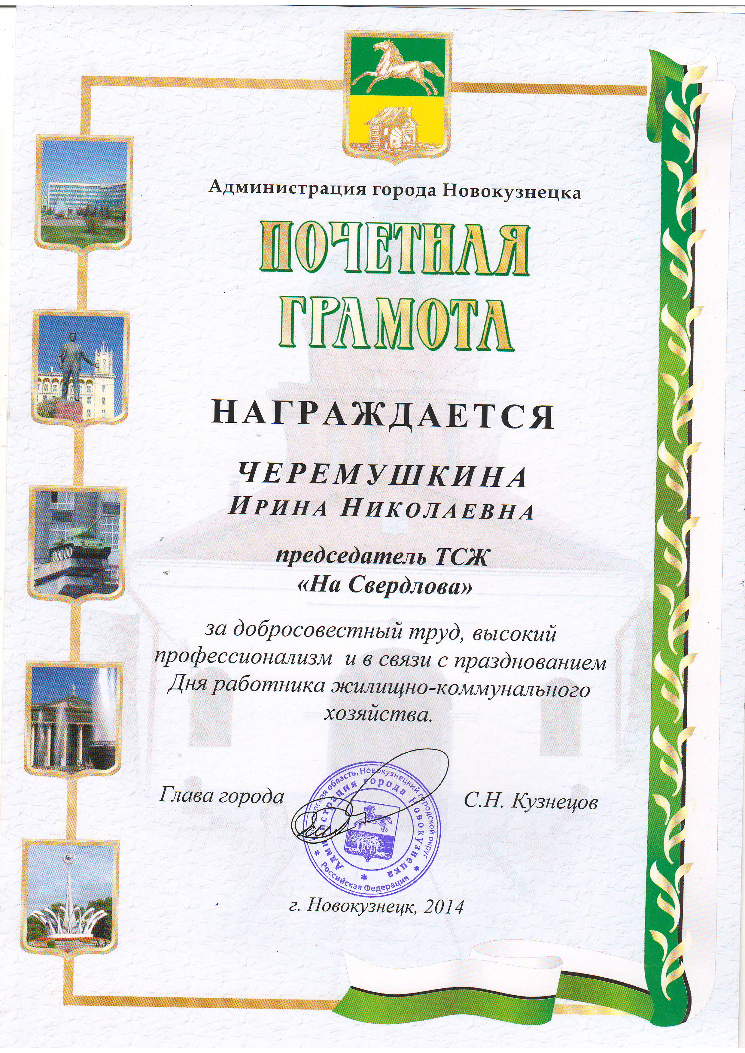 Благодарственное письмо от администрации Новокузнецка ТСЖ На Свердлова_2014 год |