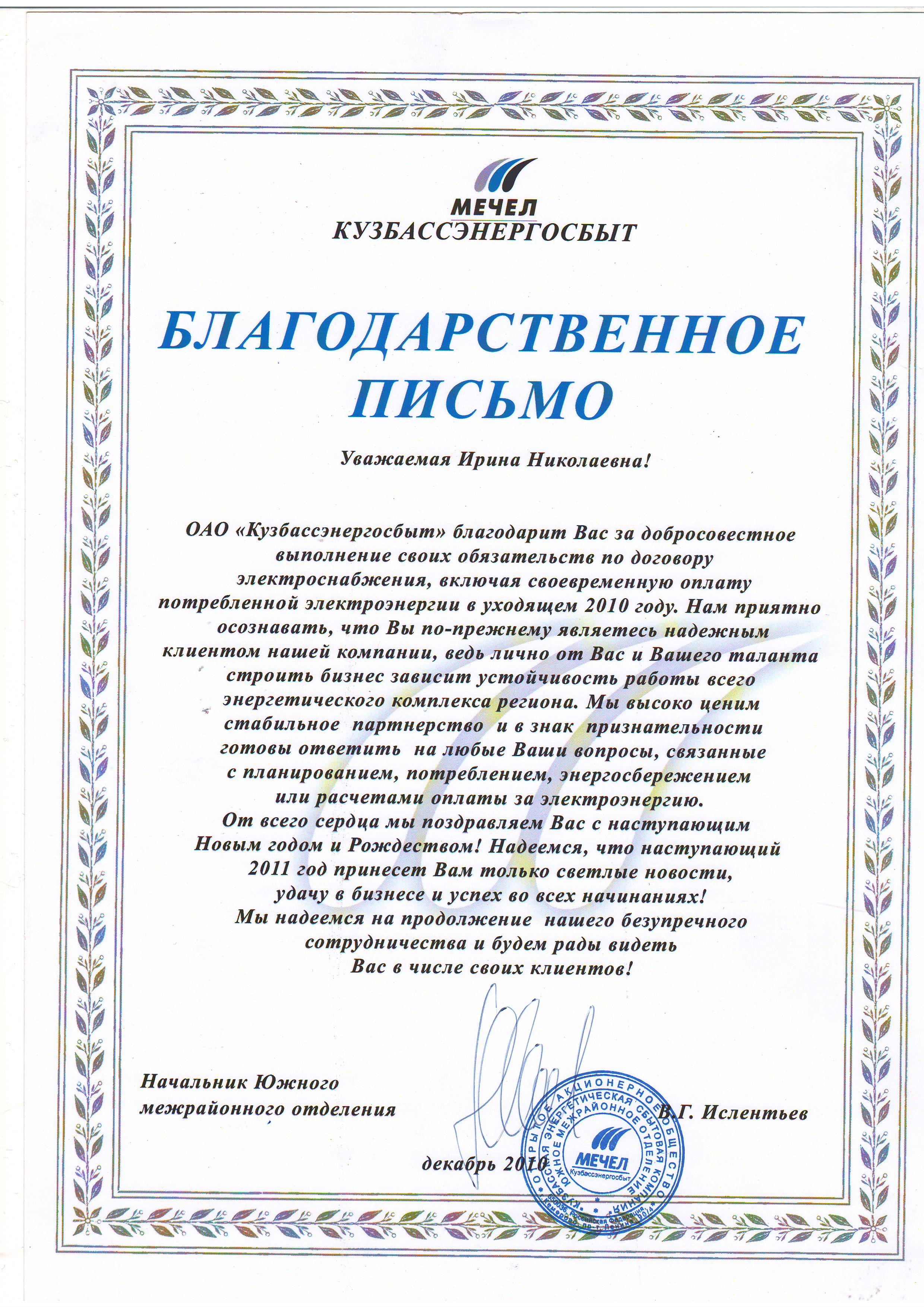 Благодарственное письмо от Мечел ТСЖ На Свердлова_2010 год |