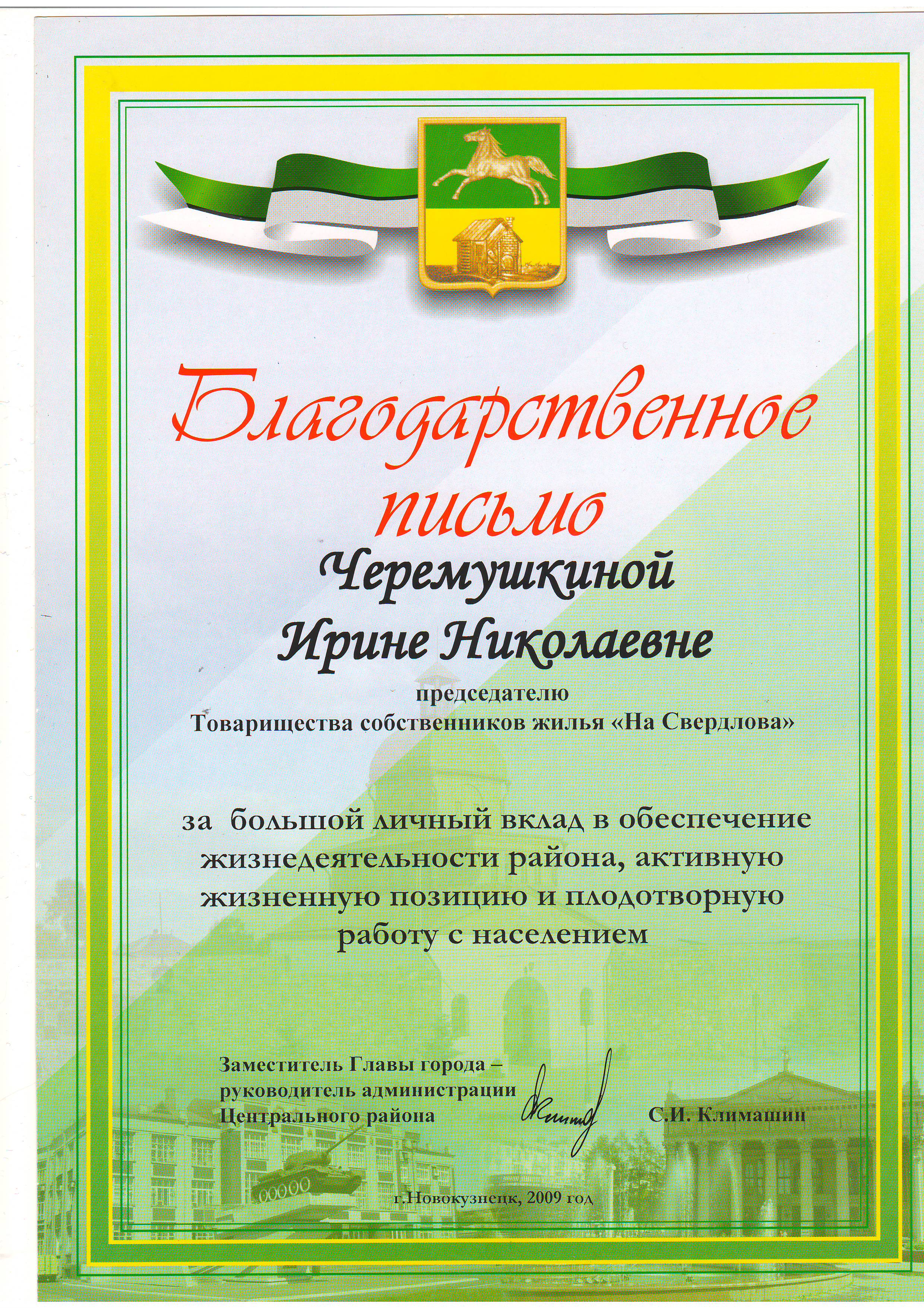 Благодарственное письмо ТСЖ На Свердлова_2009 год |