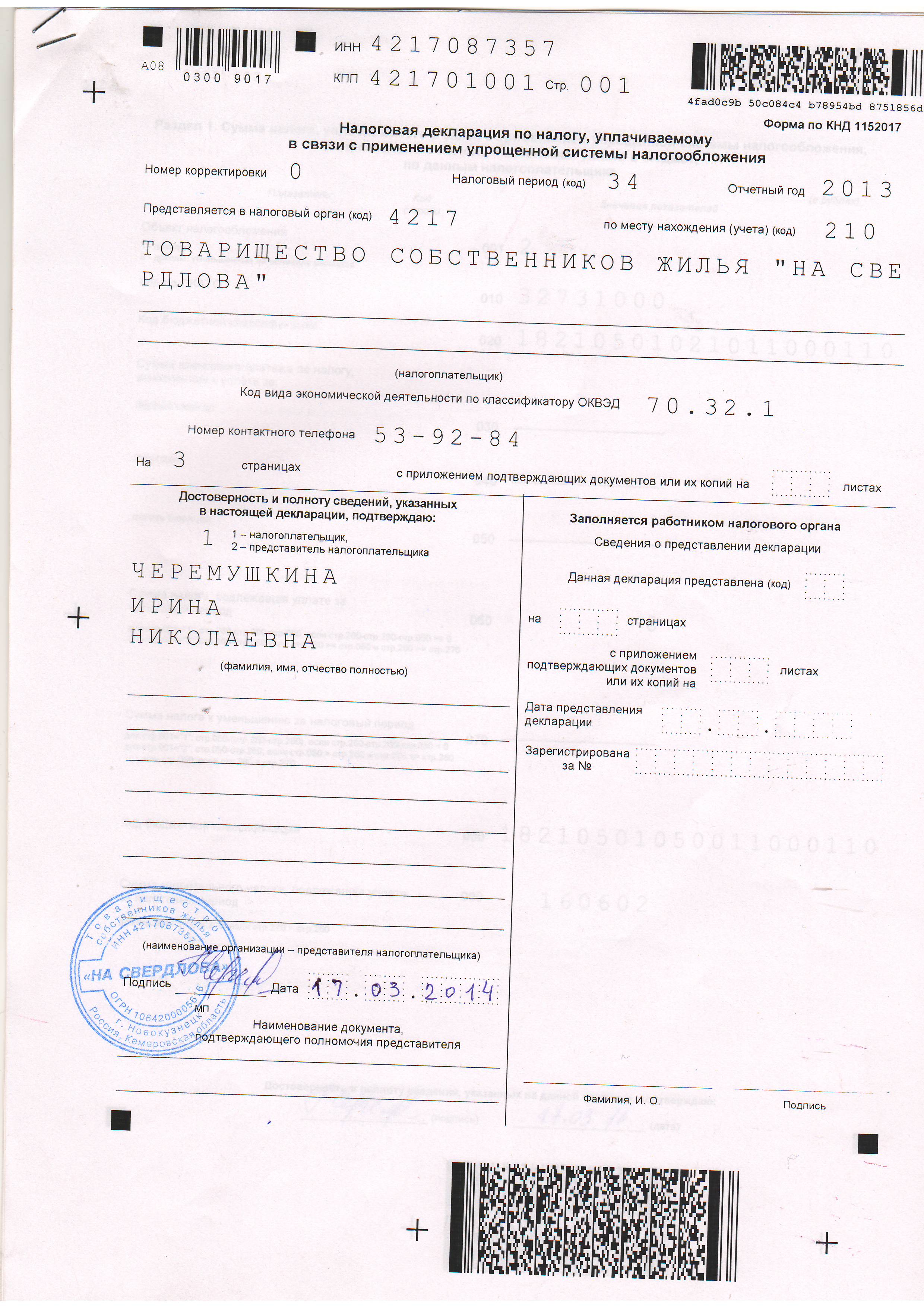 Налоговая декларация за 2013 год_ТСЖ На Свердлова_стр 1 |