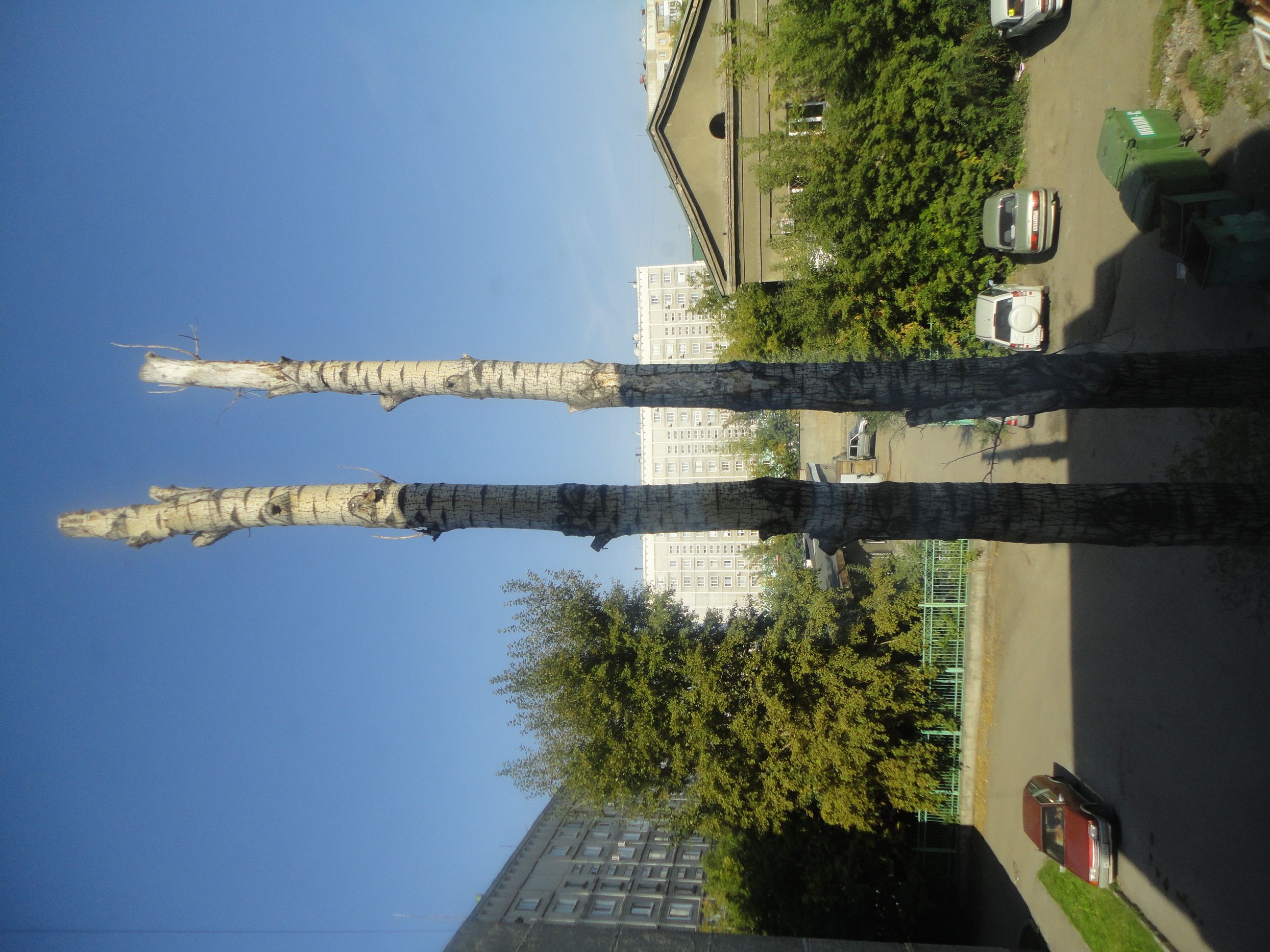 Здравствуйте! Вопрос: Уже несколько раз приступали к уничтожению старых тополей в нашем дворе и НЕ довели до конца ни разу! Сначала тополя спилили частично,надеясь,что деревья "облиствятся " и теперь уже несколько лет стоят эти остовы,пугая детей и уродуя двор.(фото №1).Особую тревогу вызывает тополь между нашим домом и детским садиком: он либо на детский садик рухнет,либо на машины,которые ставят на пустыре,а верхняя часть на наш дом ,тем более,что тополь сам стал рушится: уже отсохла и сломалась верхушка тополя!(фото №№2,3)Примите меры!!!