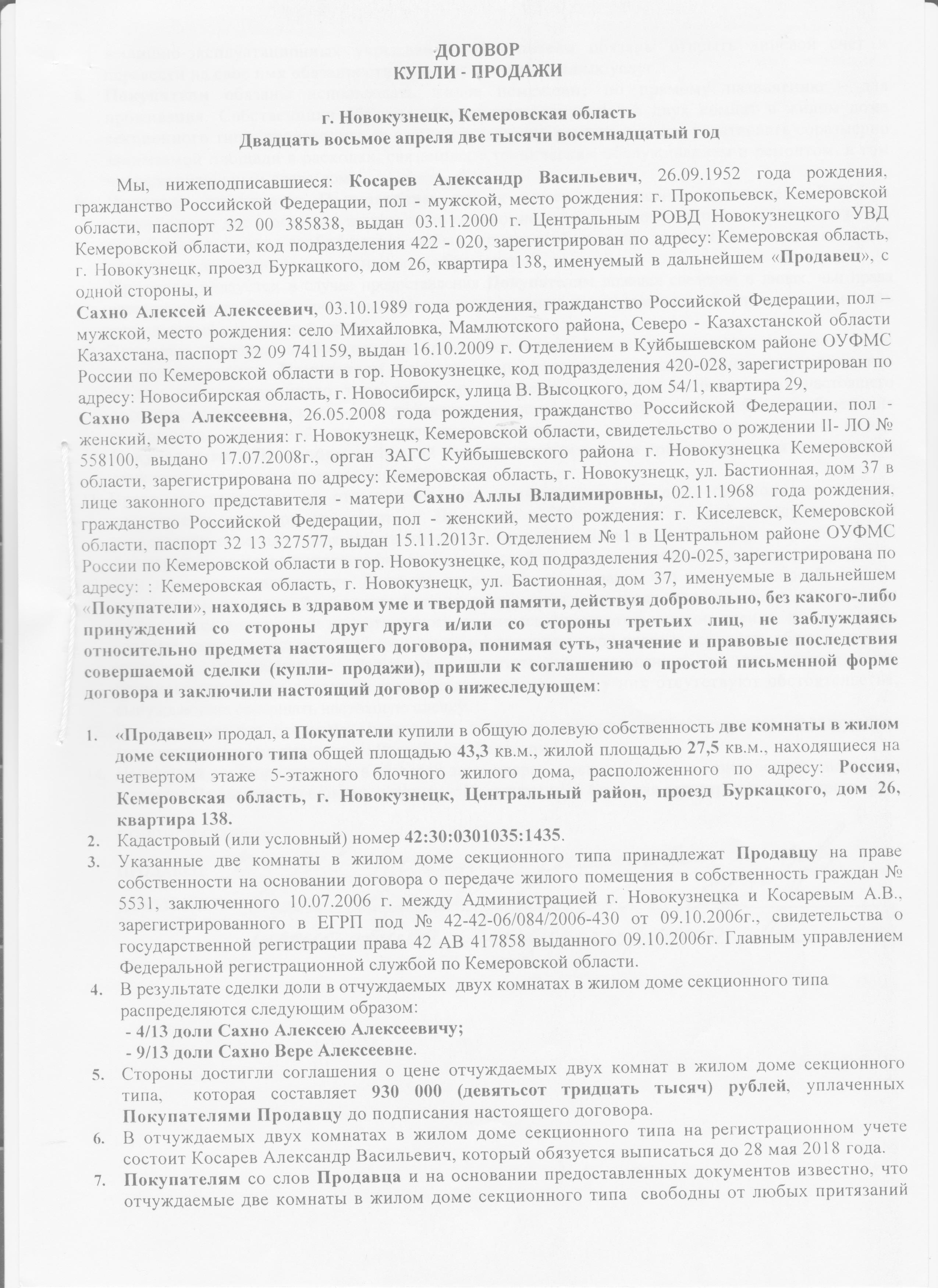 Здравствуйте. 28 апреля 2018 нами была продана квартира по адресу Буркацкого26-138. До сих пор получаем сообщения о задолженностях уже новых хозяев. Прошу внести соответствующие изменения в базу данных и закрыть лицевой счет, открытый на Косарева Александра Васильевича. Договор купли-продажи прилагаю.
