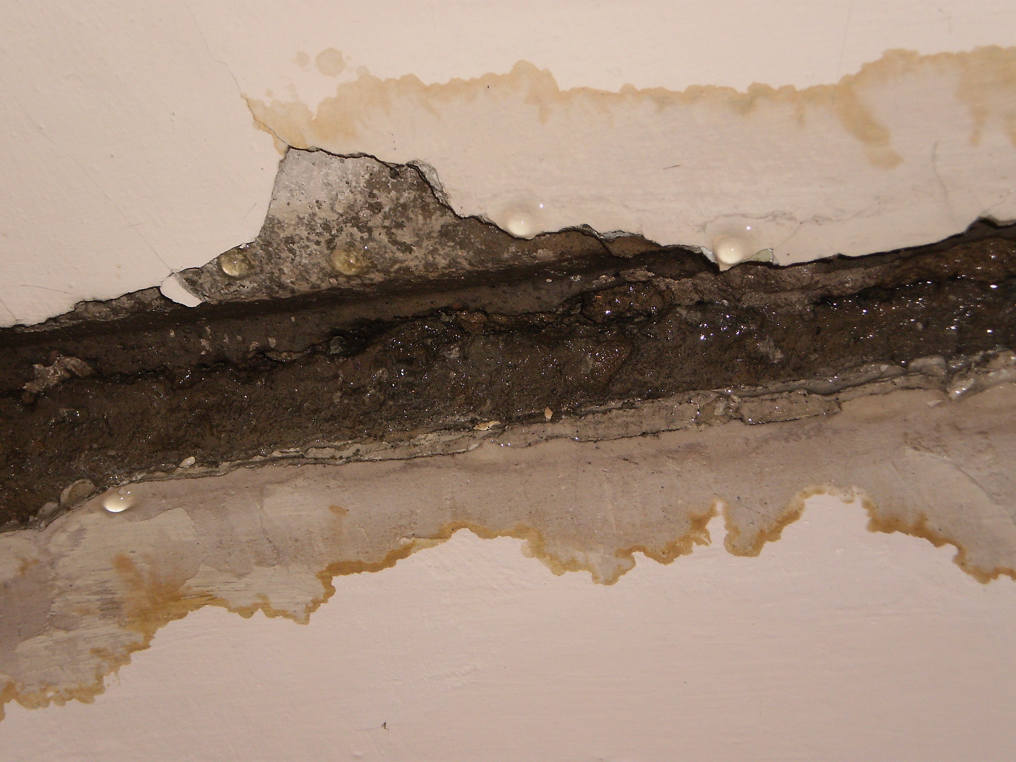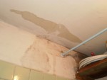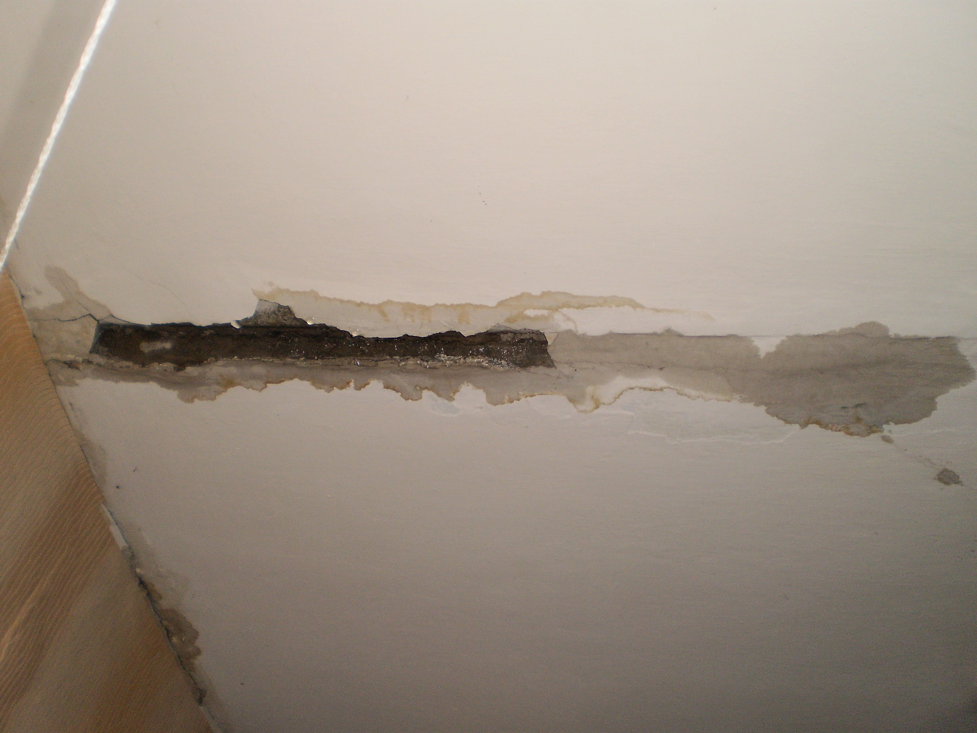 Прилагаю фото. Из-за воды начала обваливаться штукатурка и образовалась большая щель между перекрытиями. С потолка бежит во всех помещениях в квартире.