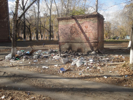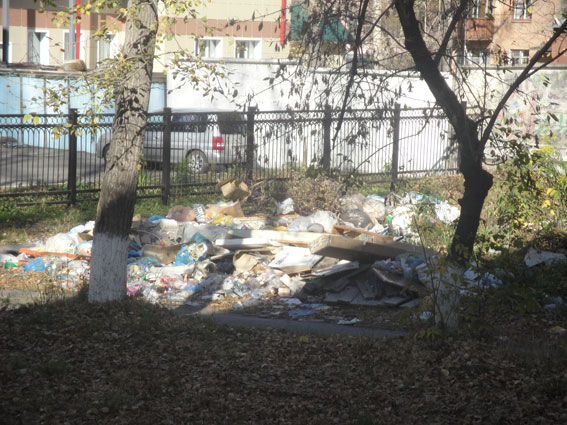 Теперь у нас там, где раньше стояли бачки, образовалась куча мусора, которая просто валяется. Теперь возникает другой вопрос: а куда, простите, жители одного дома, которым как вы говорите относится один бачок должны складывать крупногабаритные отходы, к которым относятся отходы, габариты которых превышают размеры стандартных контейнеров для твердых бытовых отходов вместимостью 0,75 куб.м: дерево (мебель, обрезки деревьев, доски, ящики, фанера, оконные рамы, двери и прочие деревянные отходы); бумага, картон (упаковочный материал); пластмасса (детские ванночки, тазы, линолеум, пленка, ящики, прочие изделия из пластмасс); металл (холодильники, газовые и электрические литы, стиральные машины, велосипеды, баки, стальные мойки, радиаторы отопления, детские коляски и прочее металлические отходы); керамика (раковины, унитазы); резина, кожа, изделия из смешанных материалов (чемоданы, диваны, бытовая техника)? За эту услугу вы с нас берете плату. Вопрос: за что? И по вашему куда жители должны их складывать, если бачки находятся у самого дома у дороги? Они туда просто не влезут и почему нельзя было поставить бачки туда, где они раньше стояли за домом, а не ставить их посередине двора?