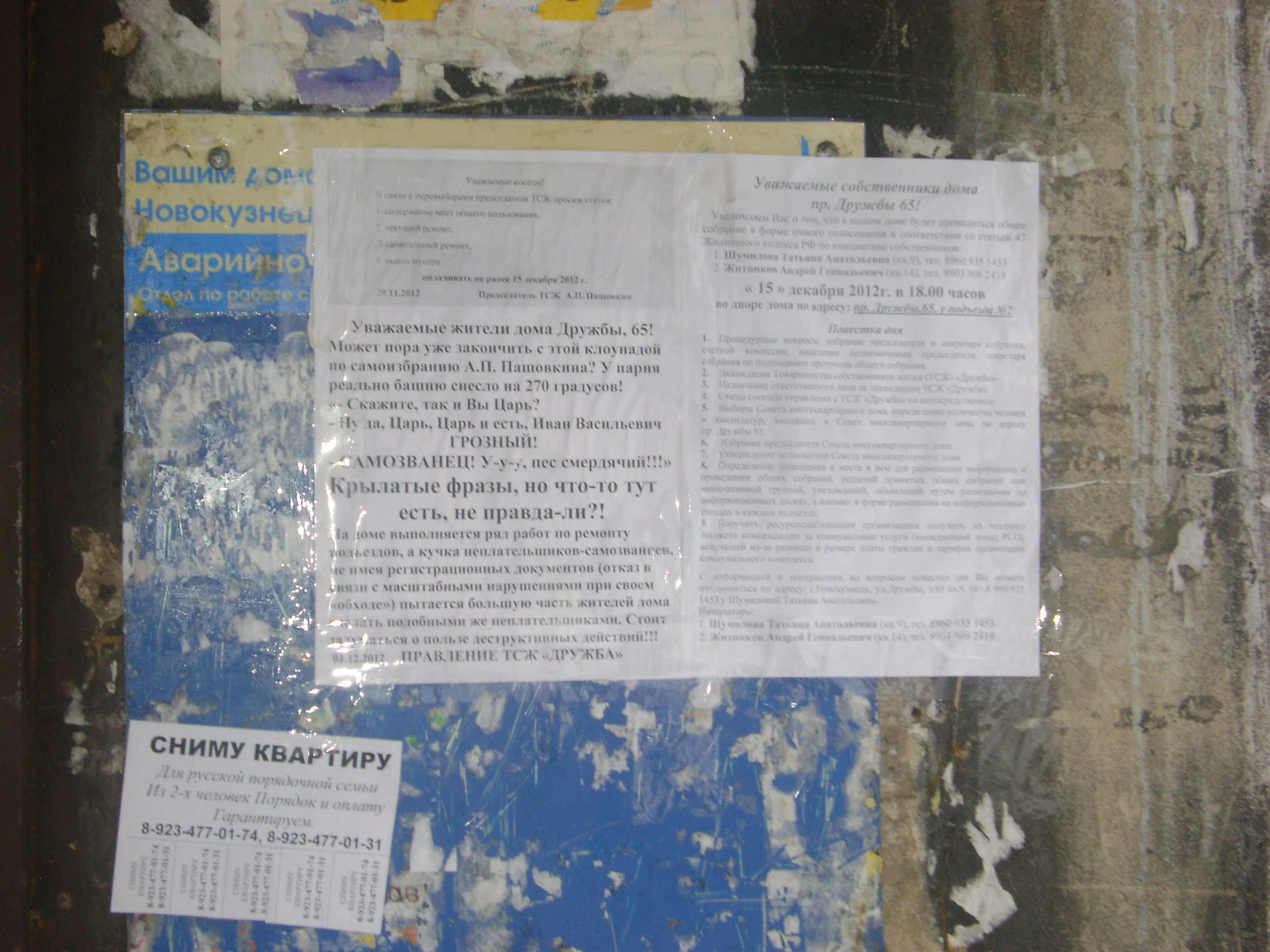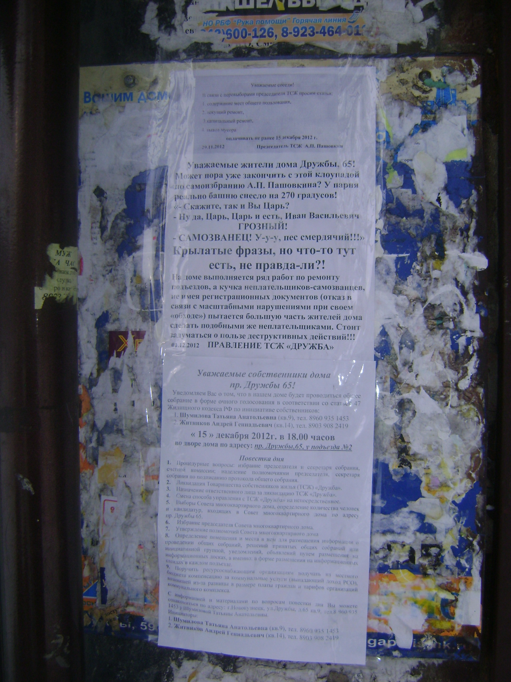 Вот меня удивляет, как без нас группа "совета дома" во главе с неплательщиками Шумиловой, Житниковым и Пашовкиным нас "женили" и так "удачно" попытались ликвидировать ТСЖ "Дружба". Однако, при это эта же группа лиц не указывает жителям Новокущзнецка и всем уважаемому ресурсу сайта Кузком, что 16 января оформлен протокол заочного голосования ЧЛЕНОВ ТСЖ "Дружба" о признании незаконной и недействительной, противоречащей действующему законодательству (ЖК и ГК РФ), Уставу ТСЖ "Дружба", не соответствующей целям и задачам создания и деятельности ТСЖ "Дружба" повестки дня по ликвидации ТСЖ "Дружба". Проголосовало 70% ЧЛЕНОВ ТСЖ, в отличии от шумилово-житниковского собрания, где бюллетени подсовывали всем желающим и нежелающим, но далеко не членам ТСЖ. 95,3% от проголосовавших высказали четкую и уверенную позицию по данному вопросу и сказали "НЕТ" ликвидации ТСЖ, подтвердили способ управления общим имуществом - Товарищество собственников жилья "Дружба" и полномочия действующего Председателя Правления ТСЖ "Дружба" В.О. Смирнова, снизили тарифы по ремонту на 1,57 руб.\м2 и утвердили эскиз размещения автомобилей на автостоянке из 54 мест, а также вступление в различные программы муниципального образования г.Новокузнецк.