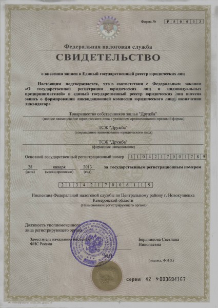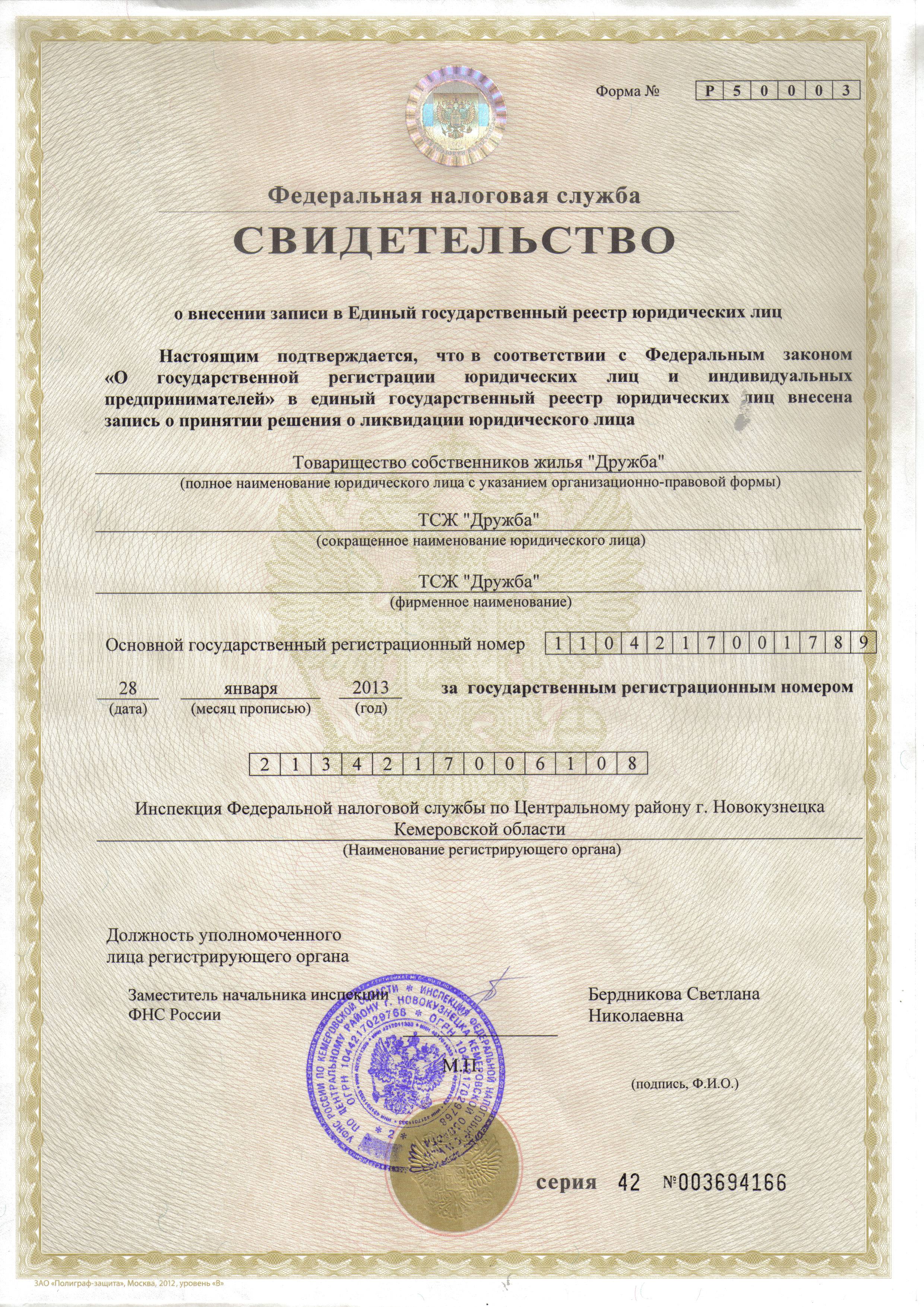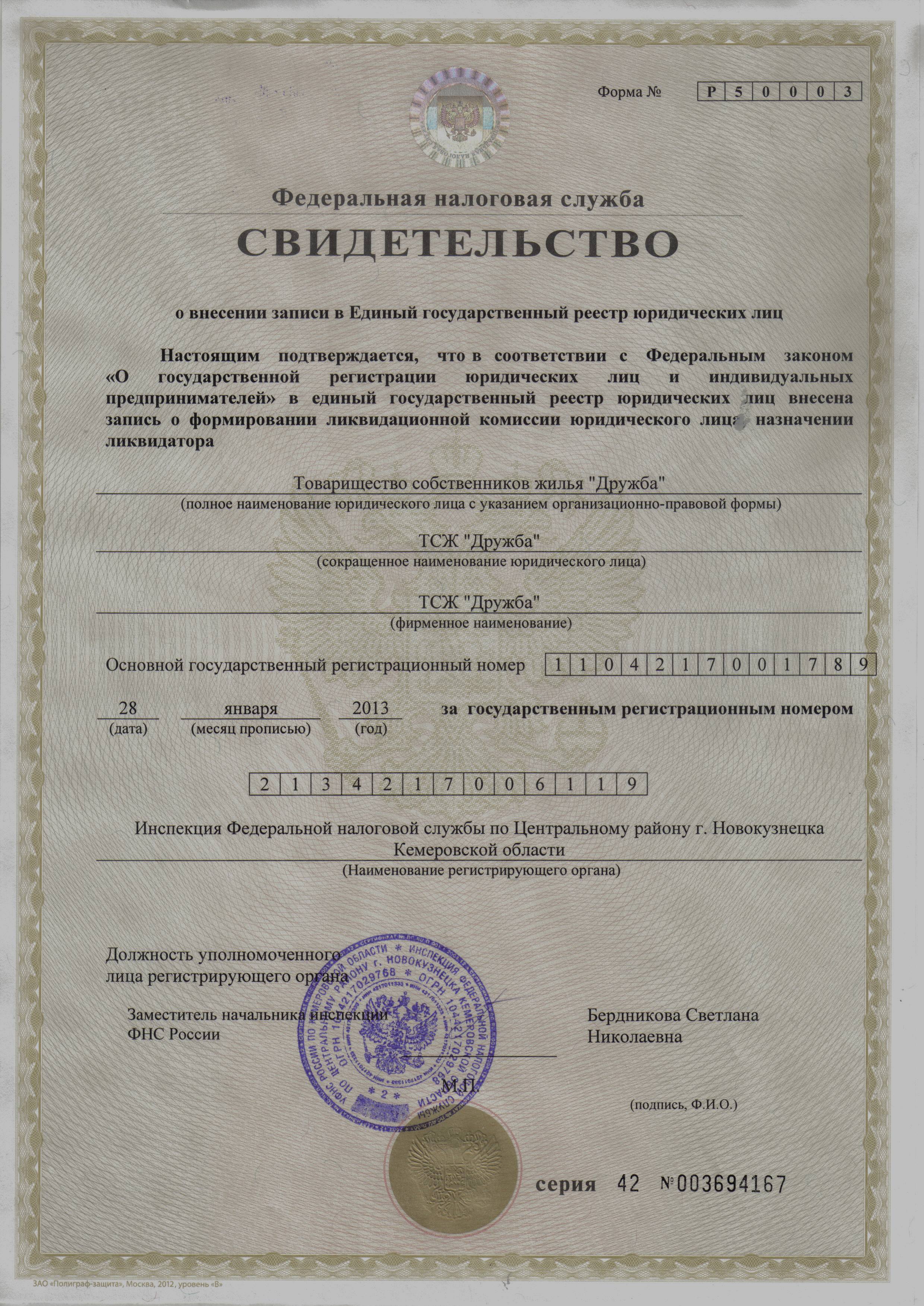 Документы из налоговой о ликвидации ТСЖ "Дружба"