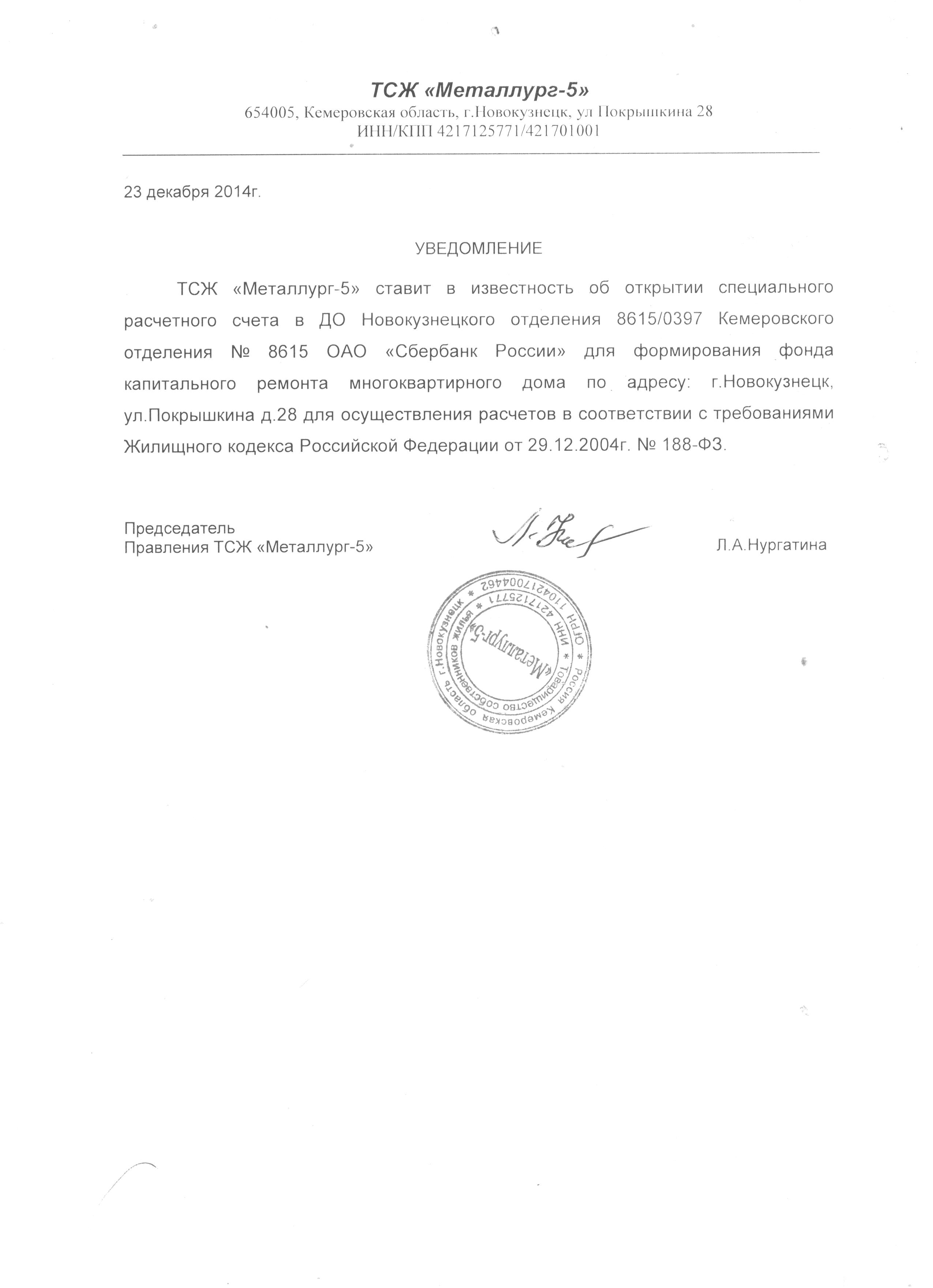 ![]() | Уведомление об открытии счёта ТСЖ Металлург-5 |
