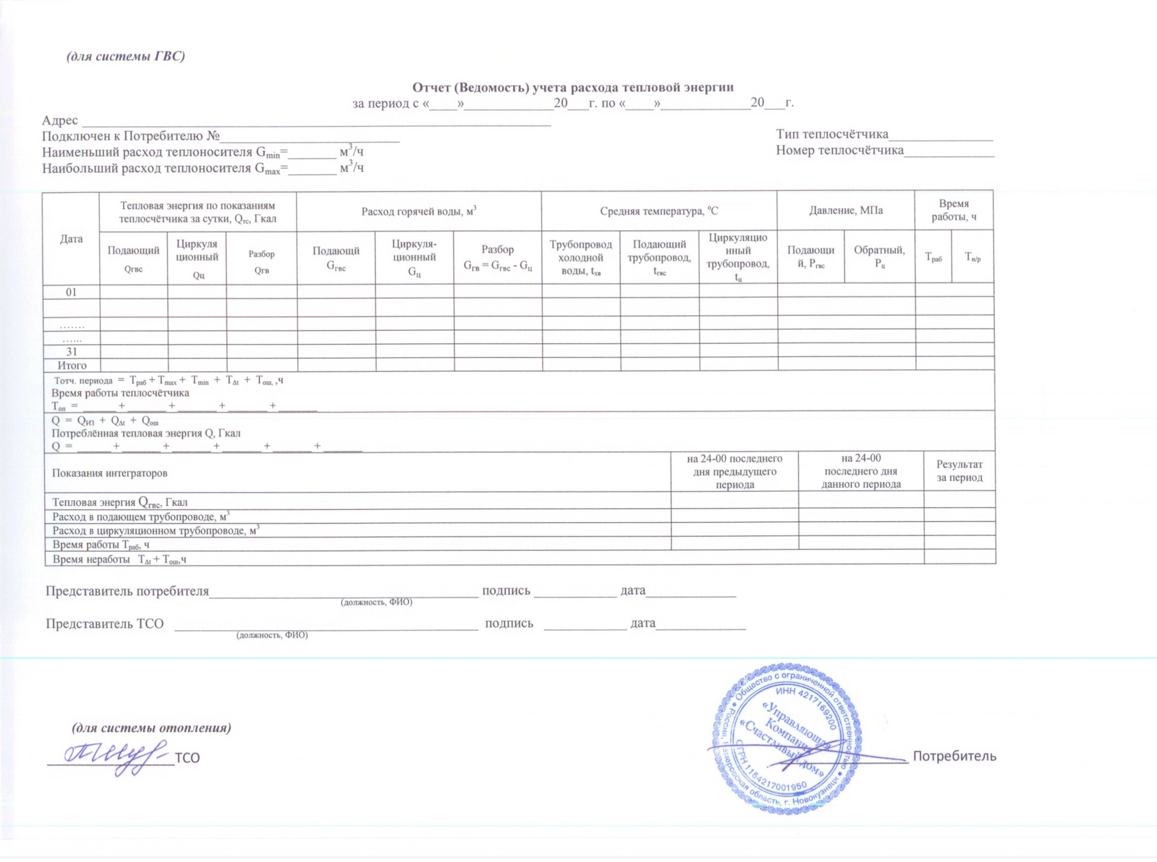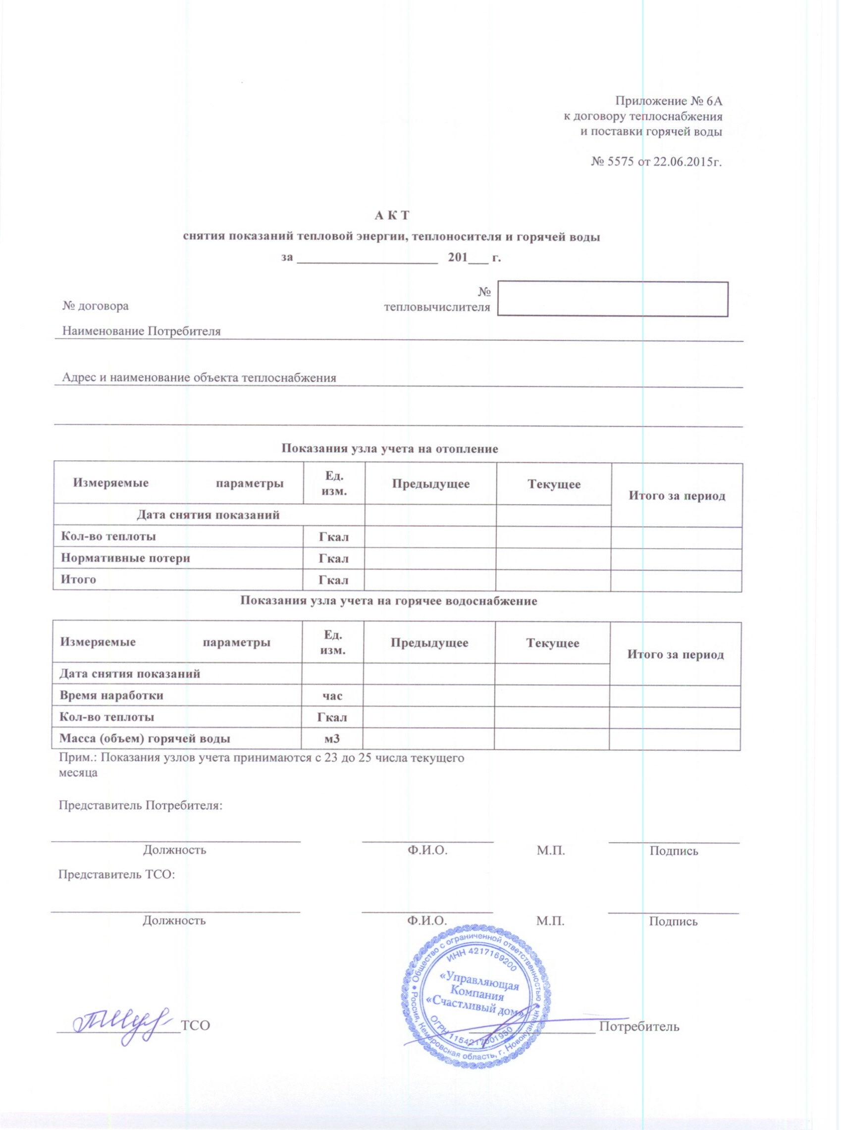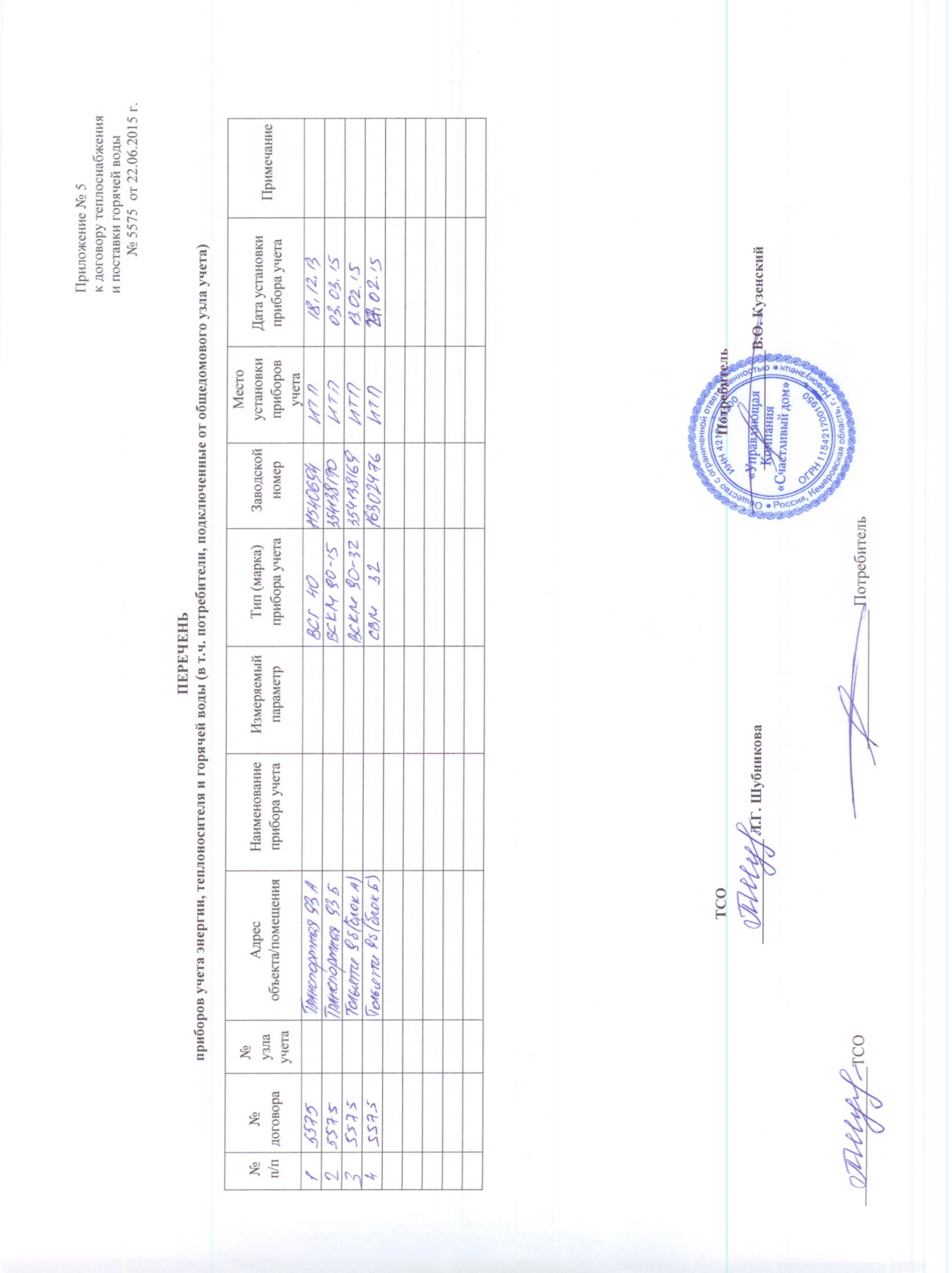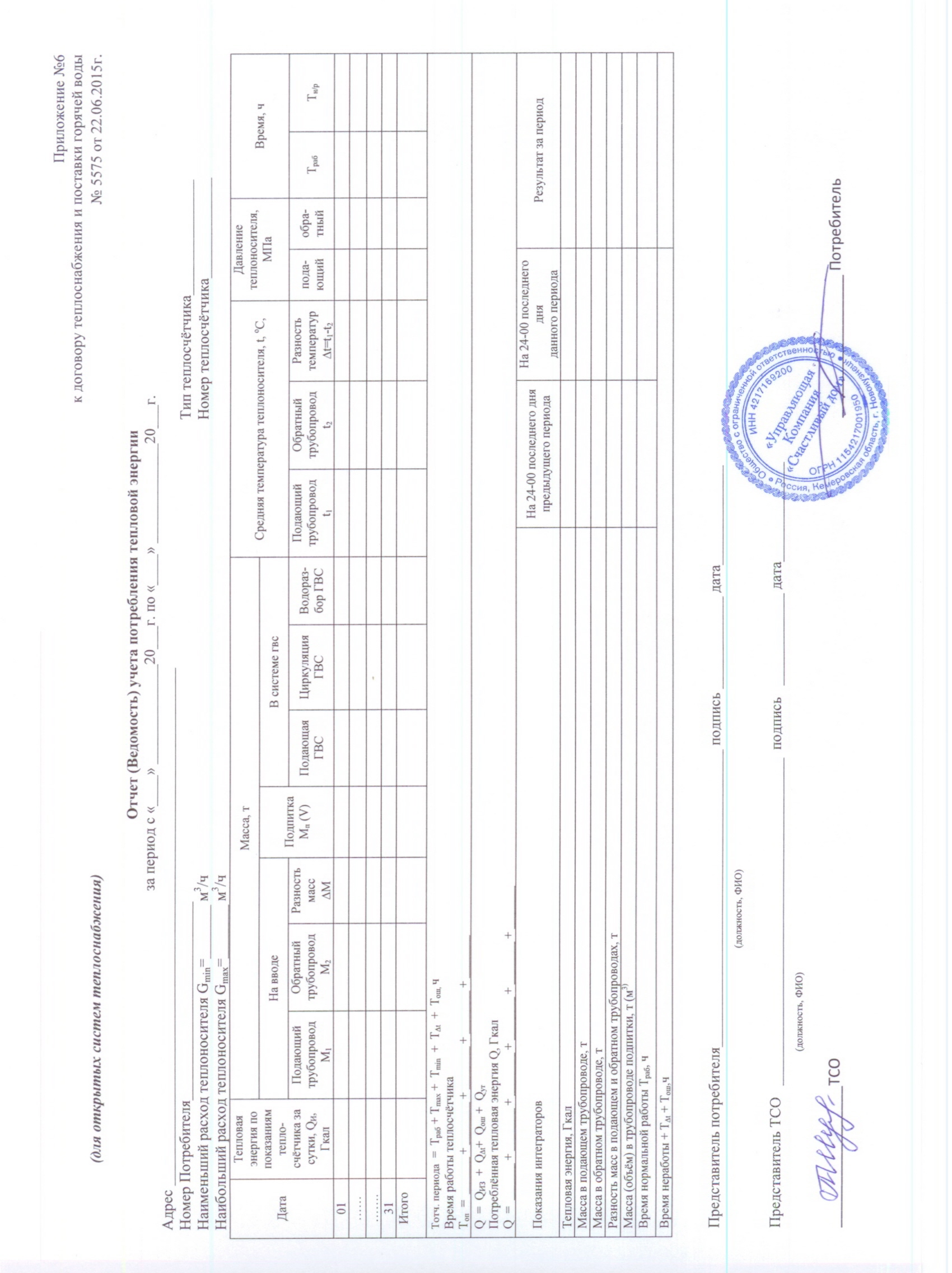 ведомость учета тепловой энергии к Договору №5575 Теплоснабжение и поставка ГВ 020 |