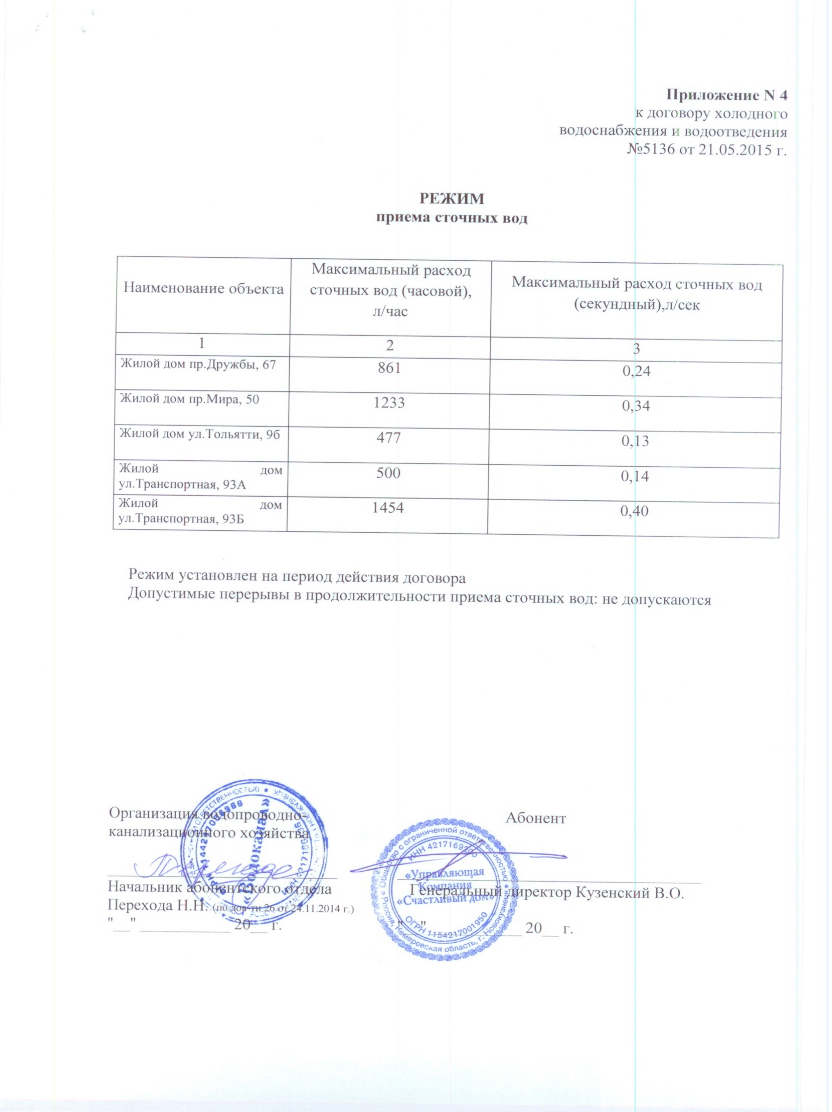 приложение №4 к Договору №5136 холодного водоснабжения и водоотведения 017 |